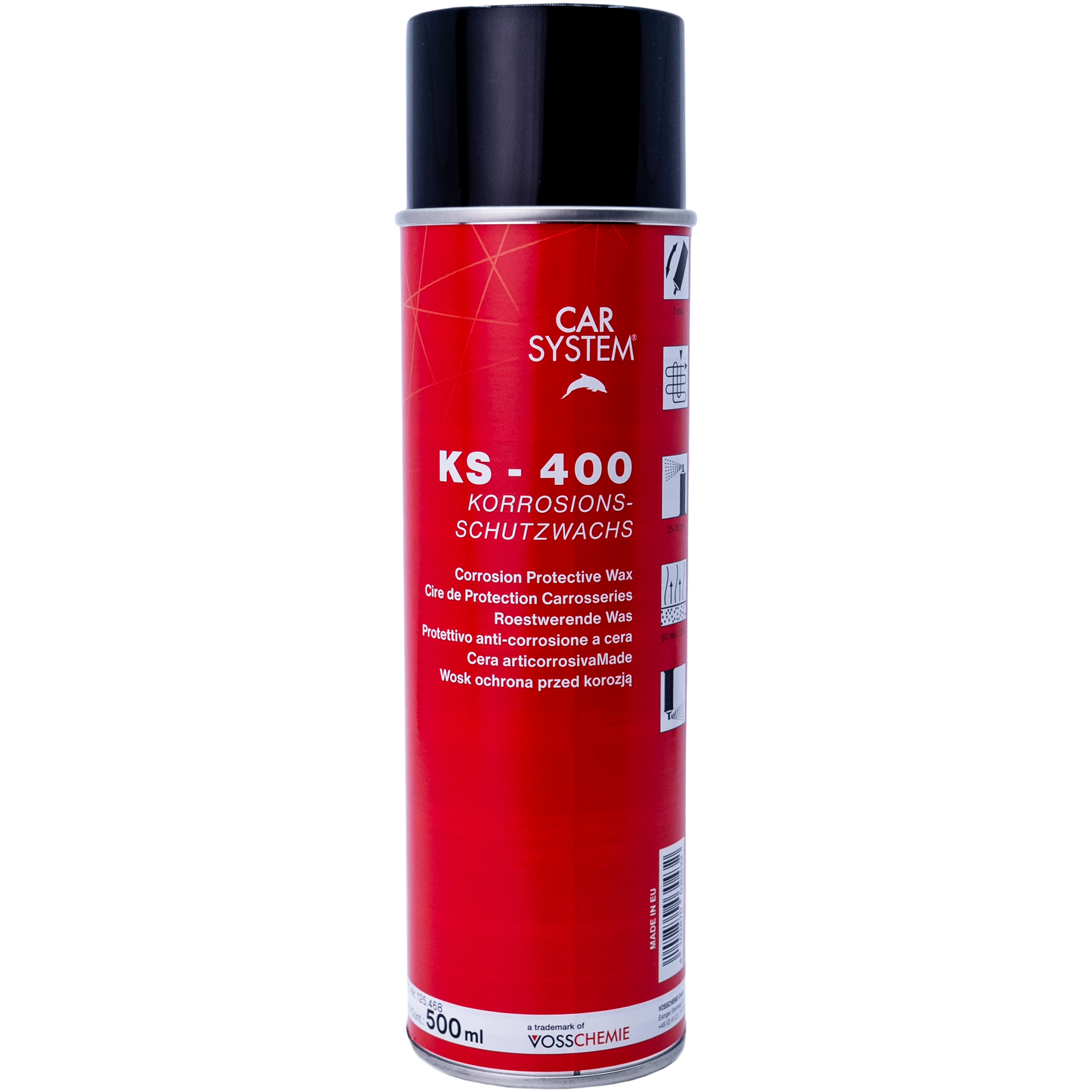 Das Carsystem KS-400 ist ein flüssiges Korrosionsschutzwachs Spray, welches als transparente Konservierung von rostgefährdeten Teilen im Karosseriebereich und, aufgrund seiner Temperaturbeständigkeit bis 160 °C, für Teilebereiche des Motors eingesetzt werden kann.