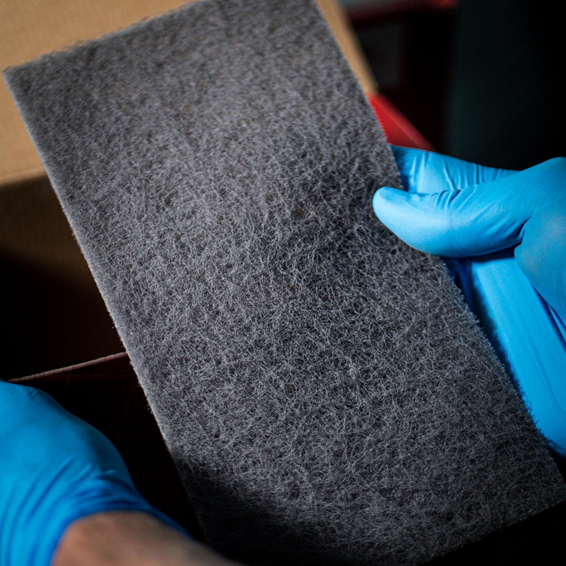 - Die Kunstharzbeschichtung durchdringt das Vlies und verteilt somit das Schleifkorn gleichmäßig im gesamten Vlies